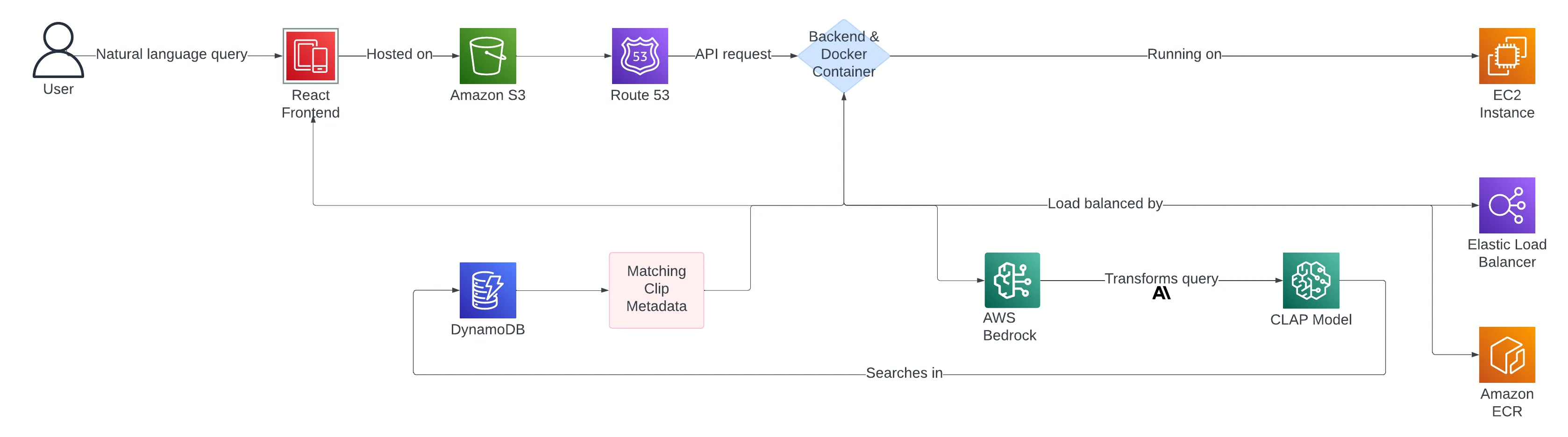 The backend interacts with AWS Bedrock, to perform LLM queries using Claude. The LLM transforms queries into suitable text for searching via a CLAP model (Contrastive Language-Audio Pretraining). The CLAP model currently lives outside of the AWS infrastructure, with plans to move that into SageMaker.
